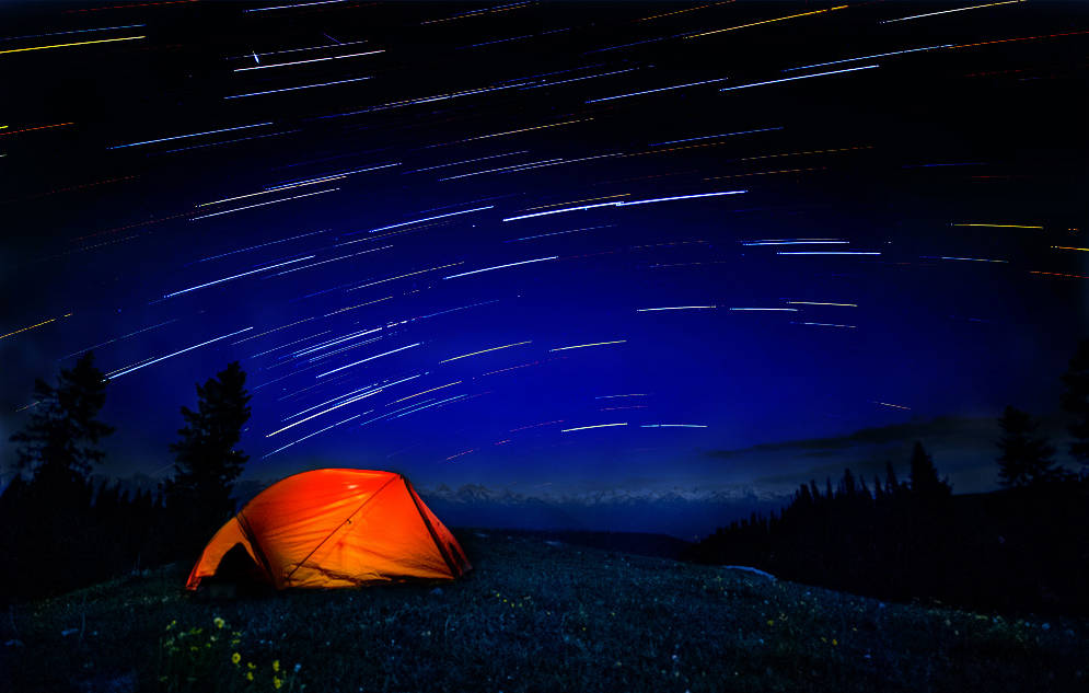 采用叠加法拍摄,100多张,拍摄约1小时,最终输出时,再叠加前景帐篷和远景日落前的雪山。