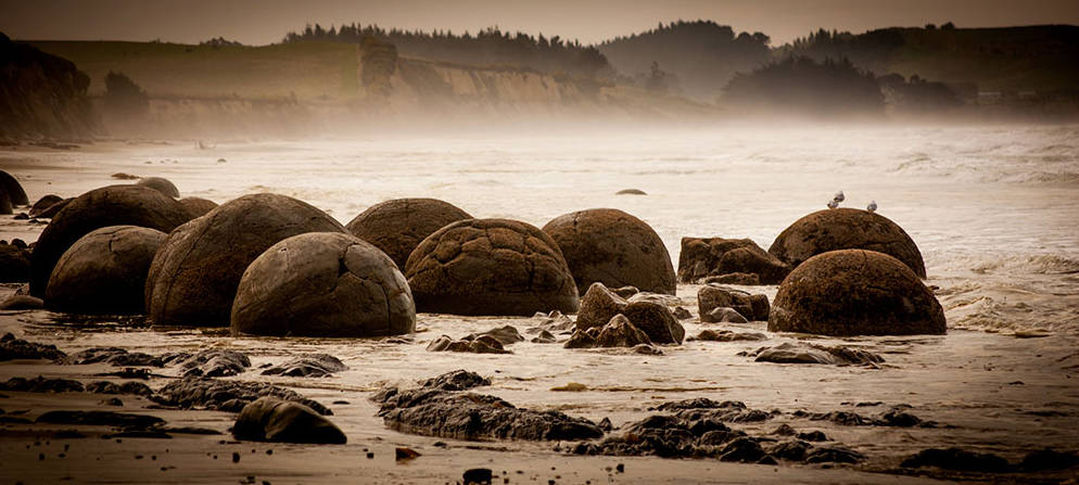 封面图。位于东海岸Dunedin市区北侧不远处的Moeraki Boulder 大圆石景区
